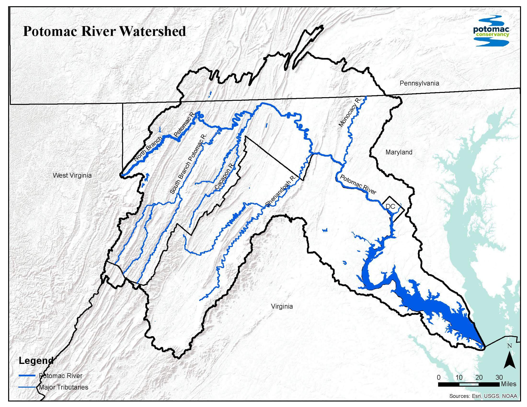 Over 400 miles in length, the Potomac River flows with fresh water from the highlands of West Virginia downstream to Washington, DC where it mixes with brackish saltwater and continues on to the Chesapeake Bay, the largest estuary in the world. The Potomac experiences daily low and high tides as far upstream as Washington, DC.